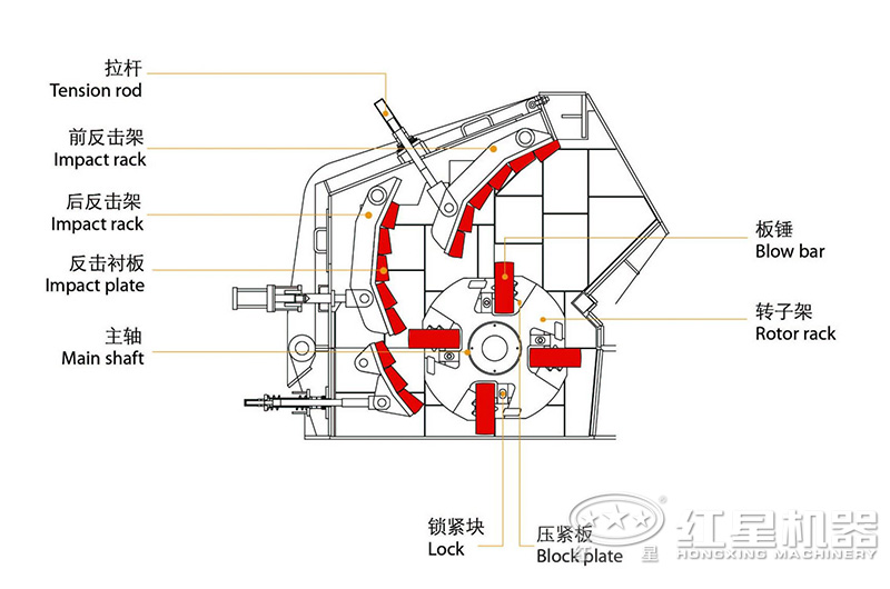 破碎的力來自兩方面,一方面是物料間的互相碰擊產(chǎn)生的作用力。另一方面,物料受到板錘的打擊、與反擊板的沖擊產(chǎn)生的力,這些力共同作用物料,使物料不斷產(chǎn)生裂縫,松散而致粉碎。當(dāng)物料粒度小于反擊板與板錘之間的縫隙時(shí),就被卸出。調(diào)整反擊架與轉(zhuǎn)子之間的間隙可達(dá)到改變物料出料粒度和物料形狀的目的。