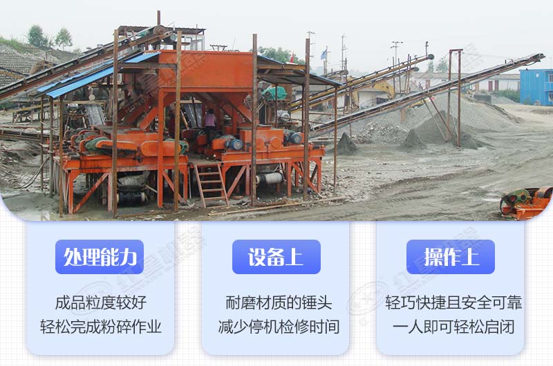 2、從設(shè)備耐磨性方面來說,雙級破碎機(jī)選用的是高合金耐磨材質(zhì)打造的錘頭,一副可頂三副使用,可大大減少停機(jī)檢修時(shí)間。